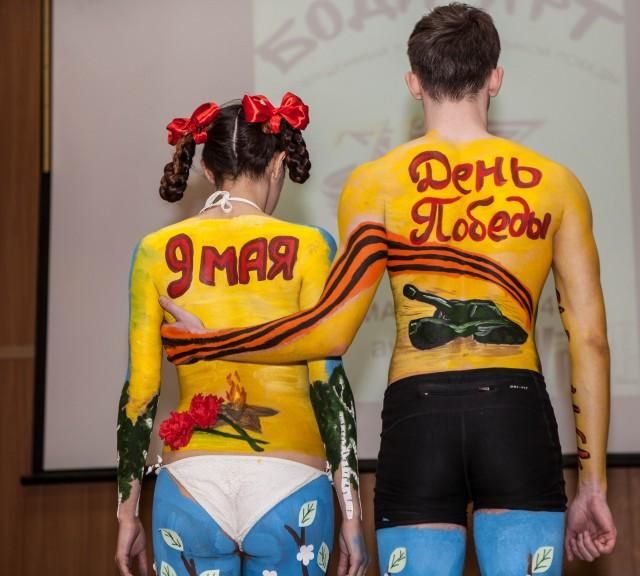 Тем временем, парад обнаженных тел продолжился в Ижевске, где состоялся студенческий конкурс боди-арта в честь Дня Победы. Его участники рисовали на себе георгиевские ленты, танки, Вечный огонь; они также складывали телами целые композиции.