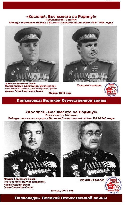 Неочевидный способ отметить День Победы предложили в Перми: городская администрация профинансировала проект «Косплей. Все вместе за Родину!» В рамках этого проекта на фотографии героев войны в графическом редакторе накладывались лица добровольцев — в том числе, членов совета при Пермской городской думе. Разразился большой скандал, по итогам которого авторы проекта вернули полученные деньги в городской бюджет; косплей приостановили.