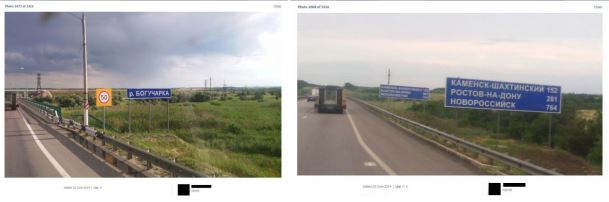 Впрочем, если судить по фотографиям, опубликованным позже этим же пользователем, проложенный навигатором маршрут – не тот, которым техника доставлялась на границу и, возможно, далее в Луганск. Или, по крайней мере, не единственный из них. Пять дней спустя пользователь загрузил фотографию дорожного указателя "Донецк 23, Промзона 4". По снимкам Google можно вычислить, что она сделана в Каменске-Шахтинском Ростовской области, гораздо южнее станицы Митякинской.