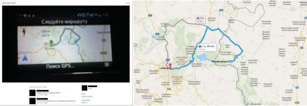 Если сравнить маршрут на экране навигатора с картой Google, видно, что его начальная точка – станица Митякинская, которая действительно расположена в 3 километрах от Украины.