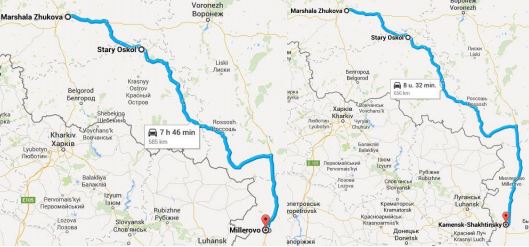 Примечательно, что обе колонны старались избегать передвижения по трассе М4. Возможно, чтобы не создавать лишних пробок на загруженной гражданскими машинами дороге, к тому же разница во времени между маршрутом по М4 и дорогой через Старый Оскол и Алексеевку составляет всего около часа. Обе колонны двигались довольно медленно, путь до точки назначения занял у них около двух дней, в то время как маршрут, проложенный на карте Google, показывает, что легковой автомобиль может преодолеть такое расстояние за 8-9 часов.