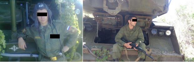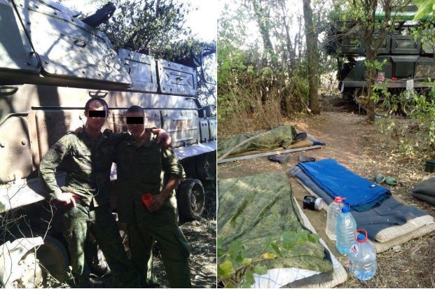 Слева: военнослужащий 53-й зенитно-ракетной бригады позирует, облокотившись на закамуфлированный ветками "Бук". Первые две цифры на шлеме обозначают номера батальона и батареи. Фото сделано в августе 2014 года. Справа: солдат этой же бригады сидит на "Буке". Географическая метка – Волошино, деревня недалеко от Миллерово. Дата загрузки фото – август 2014 года:
