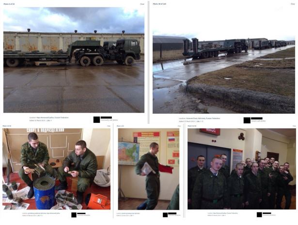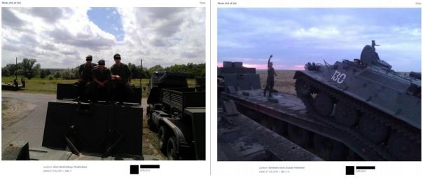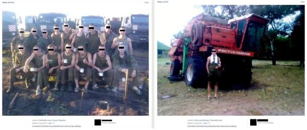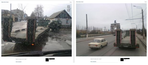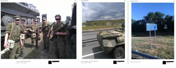 В этом сообществе мы нашли множество фотографий переброски российской военной техники к украинской границе. Некоторые из них сопровождаются географическими метками и датой. Одна из серий снимков содержит фото, сделанные в 100 километрах к югу от Москвы, в Плавске, в Курске, затем в Воронеже, Миллерово и, наконец, в станице Митякинская Ростовской области.