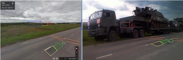 Нам нужно было понять, где сделан снимок и насколько близко это место расположено к тем точкам, где ранее "засветились" колонны с "Буками". На знаке справа от прицепа видны первые три буквы названия населенного пункта – "Бог". На нескольких видео, выложенных в интернете, видны военные колонны, проезжающие по трассе М4 через город Богучар. Ролики (1, 2, 3) сняты с эстакады, которую легко обнаружить на панорамах Google.