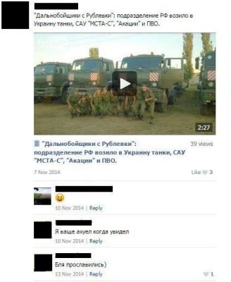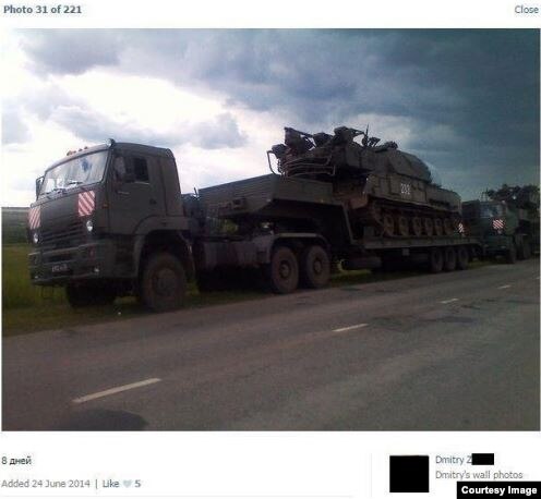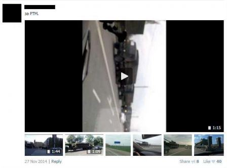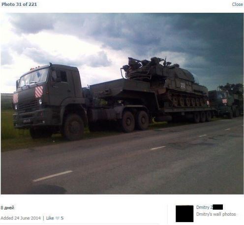 Одна из записей на стене этого пользователя содержит несколько фотографий, и даже видео транспортировки военной техники, включая "Буки". Видео снято 19 июля, два дня спустя после катастрофы "Боинга", загружено в сеть 31 июля, когда пользователь находился в Старом Осколе. Оно также размещено на Ютьюбе.