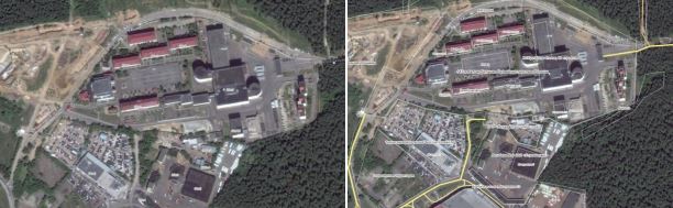 Уменьшив масштаб карты, видим, что эта точка расположена рядом с населенным пунктом Новосмолинский Нижегородской области. На спутниковых снимках Google в этом месте видна военная база, на территории которой есть тягачи и прицепы. То же самое видно и на одном из снимков сервиса Panoramio, привязанных к этой точке.