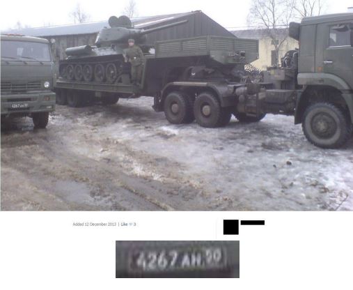 Последняя фотография, которая привлекла наше внимание в альбоме Дмитрия З., загружена 12 декабря 2013 года одним из его друзей. На ней солдат позирует на прицепе с танком. Слева – тягач со знакомым номером 4267АН50, тот самый, что вез "Бук" №3Х2 в июне по территории Украины: