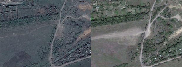 Впрочем, если бросить взгляд на спутниковые снимки местности, сделанные в апреле 2013 и в августе 2014 года, становится ясно, что "Бук" перевозили не по улице, а через поле, которое отделяет Верхнюю Ореховку от Северного – на втором снимке (справа) отчетливо видны следы тяжелой техники, которых нет на первом (слева). Скорее всего, здесь перебрасывалась и другая техника, кроме "Буков":