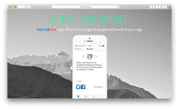 Hurry2Live позволяет быстро поделиться интересным фактом о великом или известном человеке со своими друзьями через Fcabebook или Twitter.