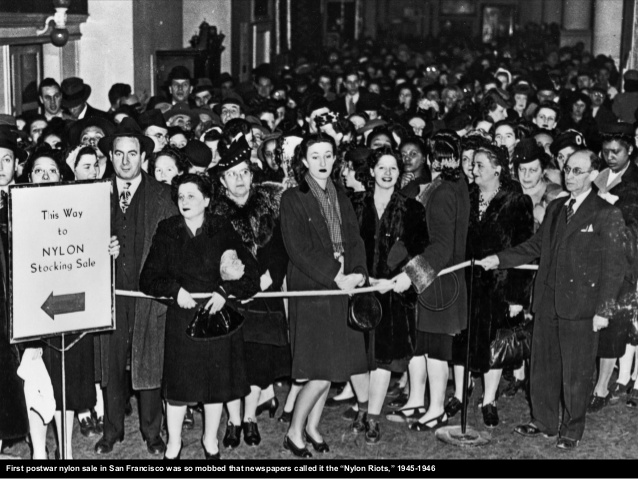 Со вступлением США во Вторую мировую войну в декабре 1941 года производство нейлоновых чулок было полностью свернуто – материал, из которого производили также парашюты, авиационный и флотский такелаж и многое другое, требовался для нужд оборонной промышленности. Драгоценный для некоторых женщин предмет костюма можно было приобрести только на черном рынке. Но и после окончания военных действий компания DuPont долго не могла удовлетворить ажиотажный спрос, что несколько раз даже приводило к массовым беспорядкам в торговых центрах, названных "нейлоновыми бунтами".
