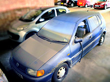 Голубой Volkswagen Polo покрыт толстым слоем серой пыли и стоит на спущенных колесах. Кроме этого, какие-то вандалы разбили боковое водительское стекло и стало видно, что в салоне машины лежат вещи и одежда, принадлежащие хозяину.