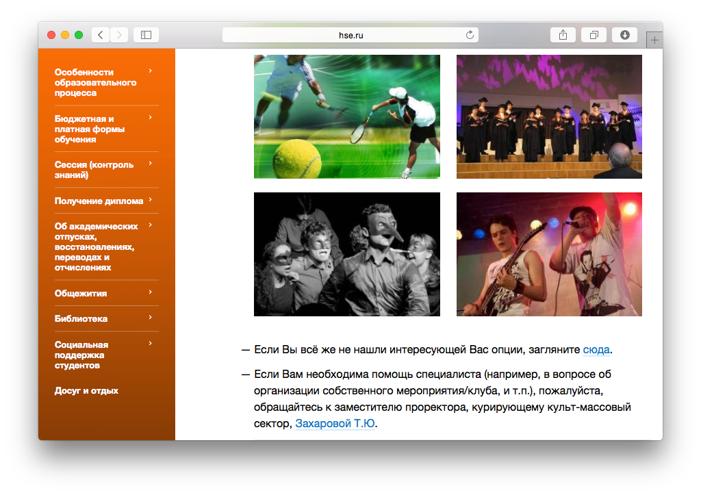 На сайте Высшей школы экономики в разделе «Досуг и отдых для студентов, аспирантов, докторантов, преподавателей и работников НИУ ВШЭ» обнаружили ссылку на порносайт. На него вел один из баннеров на странице о досуге. Другие баннеры перенаправляют на страницы различных кружков и секций вуза.