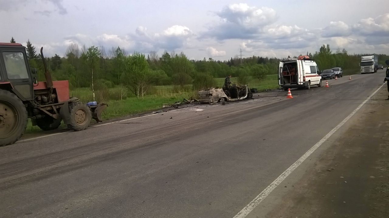 По данным дорожной полиции, «ВАЗ-2112», двигавшийся со стороны поселка Форносово Тосненского района, выехал на встречную полосу, обгоняя «Ладу Приору». Поняв, что не успевает обогнать, «ВАЗ» стал прижиматься к «Приоре» и, возможно, зацепил ее. От этого «Приора» улетела в кювет и перевернулась, а «ВАЗ» столкнулся на встречной лоб в лоб с Opel Astra. Сгоревшие заживо мужчины находились в «ВАЗе». Также погибла тридцатилетняя девушка-водитель Opel.