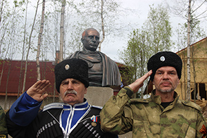 «Мы не могли ждать, — объясняет Андрей Поляков. — Мы хотели увековечить память президента. И решили сделать это в образе римского императора — ведь это образ победителя. Он разрушил так называемую берлинскую стену, которая разделяла наш народ. Наконец-то народ вместе. Крым был присоединен без всякой крови, в том числе и казачьей». Андрея Полякова прерывает ведущий, который предлагает сдернуть покрывало с бюста.