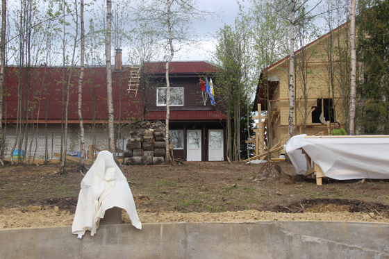 Сам атаман Поляков в ожидании открытия монумента осматривает собственные владения. Видно, что тут торопились: стоит наспех сколоченный стол для будущего пира, на нем салаты. Кстати, рядом же недостроенная деревянная церковь. В ста метрах от бюста загон для гусей, которые тем не менее бегают по всему участку, несколько ульев. Два из пяти ульев не слишком патриотично выкрашены на жовто-блакитный лад.