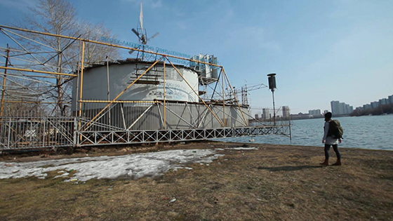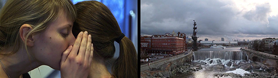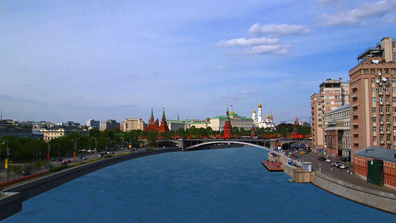 Елена Коптяева. Поверхность. 2014. Кадр из видео Случайна ли эта точка наблюдения? Елена говорит, что специальной привязки к месту нет: «Мне просто был нужен популярный городской пейзаж. Когда ты делаешь работы, где что-то дополняешь или изменяешь, у тебя всегда должна быть какая-то точка входа для зрителя. В данном случае это понятный каждому человеку вид, на который можно посмотреть и начать искать другие хитрости, которые художник мог заложить, а мог и не заложить туда». То есть речь идет об изображении, хорошо нам известном, но абсолютно стертом в нашем восприятии: «Я помню, что у меня по выставке (имеется в виду первая коллективная выставка студентов школы «МедиаАртЛаб». — Ред.) ходили ребята и пытались понять, что же там еще изменено, кроме реки. То, что я заменила один элемент, привело к цепной реакции — человек начинает цепляться, работать со своими стереотипами, у него начинает работать внимание».
