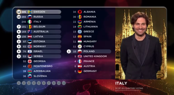 Эстония дала 10 баллов Швеции и 12 России. От Италии отрыв серьезный уже.