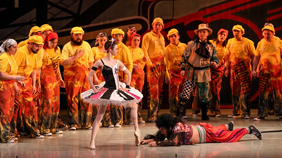 © Антон Завьялов / Дягилевский фестиваль Мирошниченко рискнул сыграть на той же территории, что и десять лет назад Алексей Ратманский («Болт» и «Светлый ручей» в Большом театре). Дошло до буквальной трансплантации образов: сцена в ресторане, вариация гармониста, кордебалет в резиновых масках. Та же травестированная классика в фантастической сцене на небесах, тот же прием звучащего текста — длинная инструкция по использованию противогаза, голос с грузинским акцентом, исчезающим к середине, вульгарный сурдоперевод на сцене.