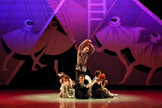 В «Условно убитом» нет уже ни вокала, ни хоровой массы — чистый балет. Нужно станцевать странное либретто: мороженщица Маша Фунтикова и Стопка Курочкин любят друг друга, их свидание прерывают учения, влюбленные теряются в беготне людей в противогазах. За Машей приударяет военрук Бейбуржуев, потом все попадают на небо, а в финале снова надевают противогазы, отчего Бейбуржуев хватается за голову. Сюжет 1931 года, поправленный хореографом, но утративший злободневный пафос и блеск эстрадного ревю, стал заспиртованным головастиком — реанимировать его могли отличная хореография или отличное чувство юмора. Увы.