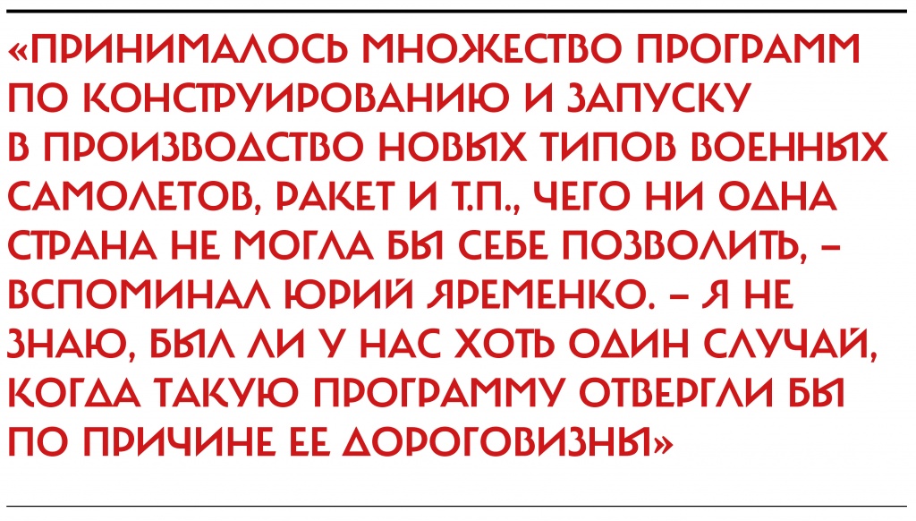 Советская экономика и общество были больше похожи не на современную им Европу и Америку, а на Древний Египет, где строительство пирамид было цементирующим элементом и целью всей цивилизации. Это сравнение принадлежит Юрию Яременко, экономисту, академику, которого называли одним из «возможных спасителей СССР». Яременко в 70–80-х годах доказывал то, что за полвека до него пытался доказать другой советский экономист, Борис Фельдман: тяжелая промышленность, хотя основную ставку и нужно делать на нее, не должна слишком уж далеко отрываться от второго, потребительского сектора во избежание непреодолимых диспропорций. Тем не менее достижения всего советского ВПК в послевоенные годы, включая, конечно же, космическую отрасль, которая была составной его частью, а также атомной промышленности и т.д., — все это можно смело считать такими же пирамидами.