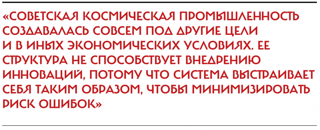 По мнению Иванова, государственные предприятия, использующие советский потенциал, не жизнеспособны в современных условиях. «Советская космическая промышленность создавалась совсем под другие цели и в иных экономических условиях, — разъясняет он. — Ее структура не способствует внедрению инноваций, потому что система выстраивает себя таким образом, чтобы минимизировать риск ошибок. Для этого она создает множество барьеров: бесконечные проверки и недоверие к смелым решениям».