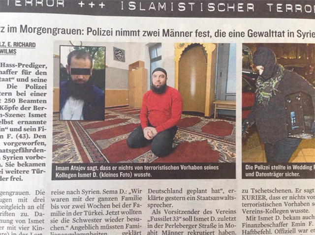 Atayev is Dagestani. He was not arrested in the raid. After the searches, he posted a video on his social network page entitled “The Berlin Spectacle,” in which the imam walked around the mosque, talking to the viewer: “There was a search in the mosque last night. The pigs barged in and took 11 brothers.” Atayev is active on social media and runs a Twitter account where he posts news about ISIL and hosts an online radio program for jihadists called “ShamToday.” Listeners ask questions about whether they’ll be given weapons in ISIL (“Yes, but it’s better to bring your own”) , whether they can get medical care there (“Everyone can receive free medical services and medicine”) and so on. Atayev also gives lectures titled “Patience is the guarantee of success for the Mujahideen,” “The Ordeal of Muslims,” and “Rigor in Jihad.” He is a member of the media community “ShamToday,” which creates Russian-language groups on social media with the aim of propagating ISIL and recruiting fighters. The communities occasionally post notices about fundraising drives for ISIL (this money is allegedly sometimes collected via Russian payment systems). The founder of the media community, an ISIL fighter by the name of Ilyas Deniyev, was killed in Iraq about a month ago during the seige of an oil refinery.