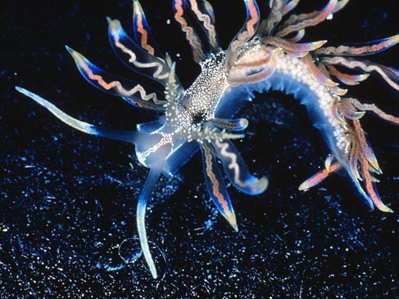 Морской брюхоногий моллюск Phyllodesmium acanthorhinum выловлен возле принадлежащего Японии острова Окинава. В список интересных видов он попал не за красоту, хотя его очертания весьма изящны, а свечение радует глаз. В его разветленном кишечнике обитают симбионты – снабженные жгутиками и способные к фотосинтезу одноклеточные существа из типа динофлагеллят (Dinoflagellata). Как правило, динофлагелляты обитают в коралловых полипах, которыми питается этот моллюск. Будучи проглоченными, они поселяются внутри моллюска и продолжают фотосинтезировать уже в пользу нового хозяина.