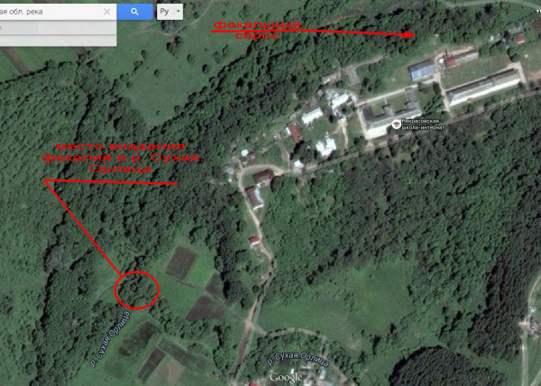 Смотрим, хвала Гуглу! из спутника. Самой говно-речки не видно, но хорошо виден связывающий пруд с р. Сухая Орлица овраг, куда сливаются фекалии.