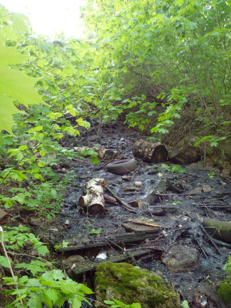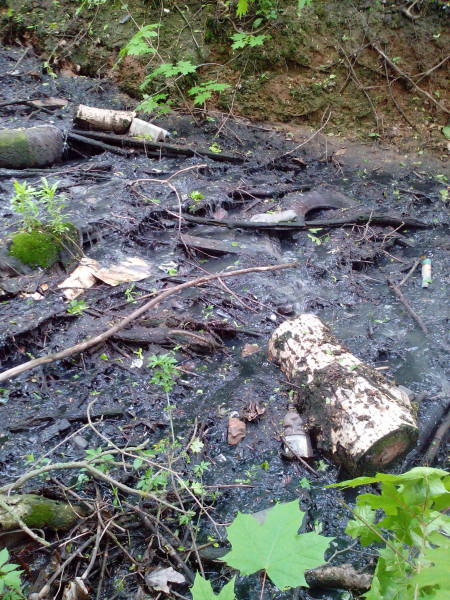 И еще ближе. Из пруда в злосчастный овраг через трубу сливается вода.