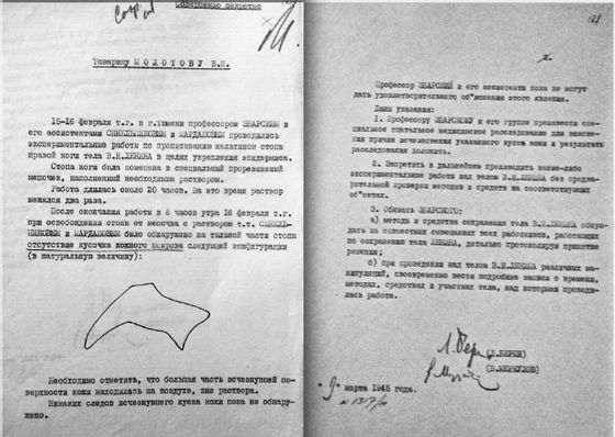 — Да, это было в феврале 1945 года, в конце войны. В 1941 году тело Ленина было эвакуировано в Тюмень, потому что боялись, что немцы могут взять Москву. Это был единственный раз за всю историю, когда тело было вывезено из Мавзолея. Оно находилось в Тюмени четыре года. Там проводились эксперименты по новым процедурам при бальзамировании разных частей тела. В феврале 45-го Збарский и его команда проводили эксперимент по пропитыванию желатином ступней Ленина, что было важно для их коррекции. Они надевали мешочек на ступню, наливали туда горячий желатин, ждали какое-то время. В общем, однажды, когда они сняли его, то увидели, что пропал довольно значительный кусок кожи с верхней части правой ступни — не подошвы, а тыльной стороны. Ты видела в моей статье письмо Берии Молотову об этом ЧП, в котором он приводит рисунок пропавшего кусочка кожи. Видимо, во время эксперимента часть кожи оказалась растворена или сожжена. Этот кусок так и не нашли. И с тех пор стали проводить все значительные эксперименты не на самом теле, а на других телах. На теле Ленина эксперименты проводить запретили. После переезда обратно в Москву весной 1945 года лаборатория была расширена, а позже был создан большой институт и при нем — специальный банк с более чем двадцатью телами, так называемыми экспериментальными объектами, забальзамированными таким же образом. Это неизвестные, которые умерли где-нибудь на вокзале, при которых не нашлось документов и которых никто не разыскивал. Кстати, как я уже говорил, институт находится на улице Красина, недалеко от метро «Маяковская». Забавно, что Красин был в комиссии по увековечиванию Ленина, то есть был одним из тех, кто принимал решение. Он был инженером по образованию, и он как раз сначала предлагал тело заморозить. Даже вывез для этого мощную морозильную аппаратуру из Германии.