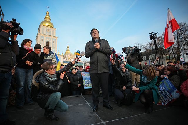 Евромайдан. Массовые протесты в Киеве начались как раз в тот момент, когда Саакашвили покинул пост президента Грузии. Саакашвили (когда-то возглавивший Грузию после «Революции роз») активно поддерживал гражданские акции против правительства Виктора Януковича; неоднократно прилетал в Киев и выступал перед демонстрантами. В своих речах, как и в многочисленных интервью западной прессе, Саакашвили крайне негативно отзывался о России, обвиняя ее во всех бедах и грузинского, и украинского народов; напоминал о грузино-южноосетинском конфликте и советовал в преддверии референдума в Крыму посмотреть на примере Грузии, «на что способны российские власти».