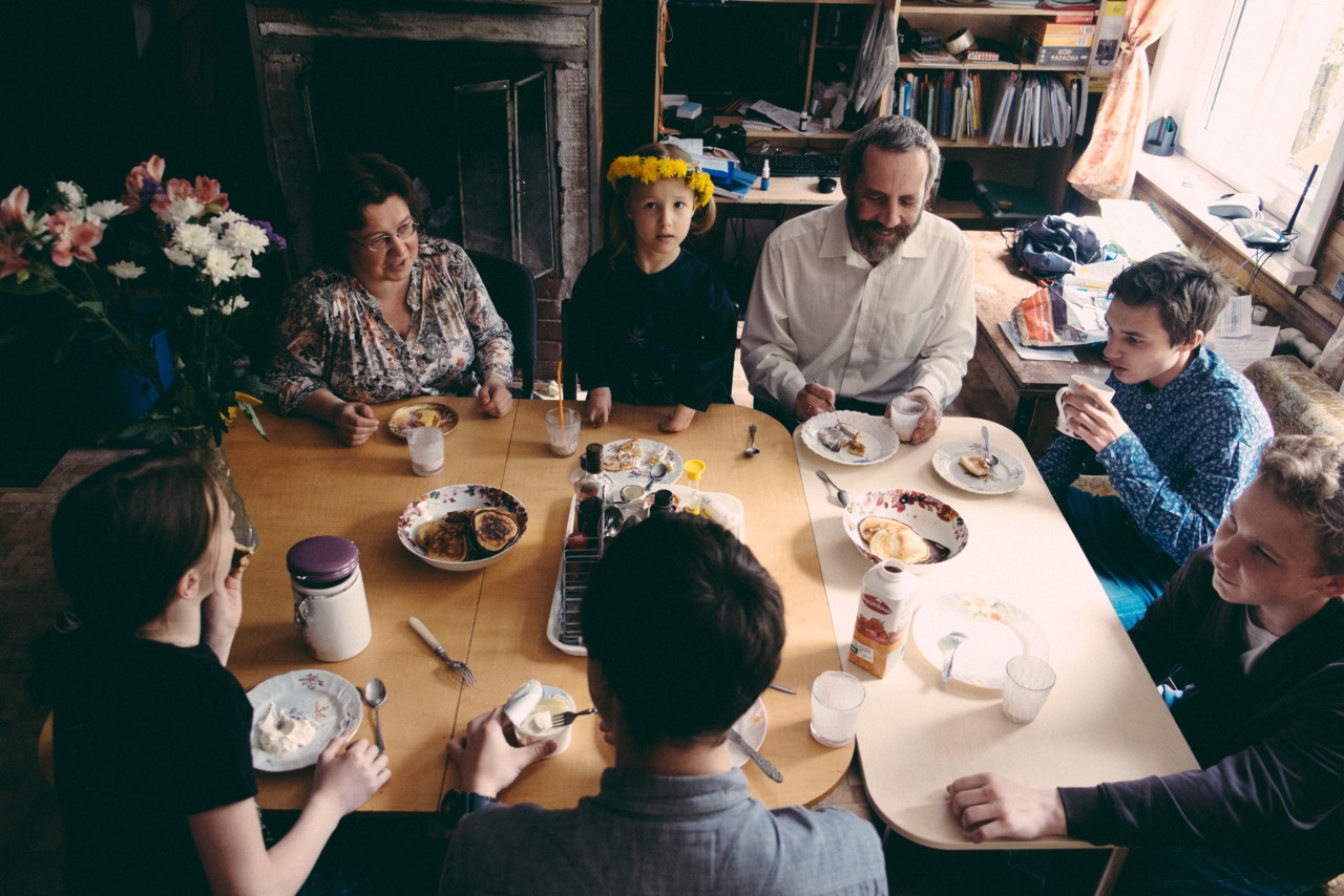 Мы попросили подругу посидеть с детьми, взяли билеты на автобус и поехали. Дорогая предстояла длинная, и я без разбору накидала себе книжек в планшет. Мы сели в автобус, для нас это было, конечно, романтическое путешествие: пятеро детей — не то что бы мы часто куда-то ходим вдвоем. Да еще и на полтора дня. Я открыла наугад книжку, муж заглянул через плечо, и где-то возле Тулы мы поняли, что все уже за нас решено. Книжка мне попалась первая по алфавиту: Александр Сегень, «Поп». Там дело происходит во время войны, и главный герой каждые две главы берет по ребенку.