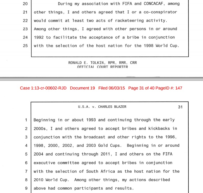 Между апрелем 2004 года и маем 2011 года я и другие люди, являвшиеся доверенными лицами в ФИФА и C0NCACAF, в нарушение наших обязанностей, находясь на официальных должностях, согласились участвовать в мошеннических схемах... принимая взятки. Я и другие лица согласились использовать и-мейлы, телефонную связь и электронные переводы в и за пределы Соединенных Штатов для продвижения этих схем. Средства, полученные от этих неправомочных платежей, передавались через аэропорт JFK в форме чека".