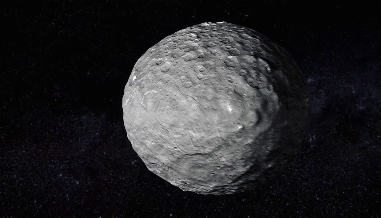 NASA представила видеозапись с трехмерной анимацией Цереры — карликовой планеты в поясе астероидов Солнечной системы. Ученые сделали анимацию, склеив 80 снимков, полученных с космической станции Dawn. Фотографии сделаны с высоты от 5,1 до 13,6 тысячи километров. На видеозаписи видны в том числе и таинственные светящиеся пятна.