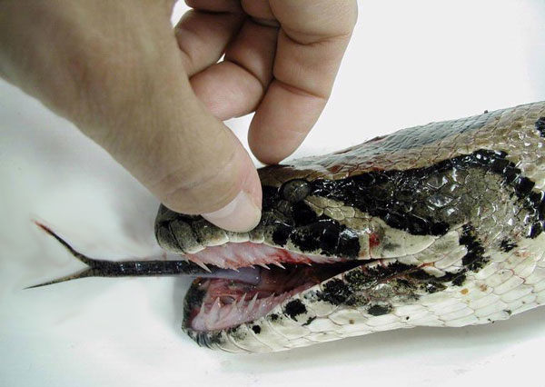 Питон. Фото: invasive.org Комментарий редактора: Позже выяснилось, что смерть женщины наступила в результате аллергической реакции на укус питона. Сами питоны относятся к семейству неядовитых змей — таким образом, гибель человека, скорее, является роковым стечением обстоятельств. Случаи нападения крупных питонов на человека известны, но жертвы, как правило погибали от удушья — эти змеи ловят свою добычу, хватая ее зубами и одновременно сжимая кольцами своего тела.