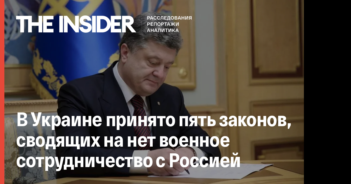 Сегодня президент Украины Петр Порошенко подписал пять законов, разрывающих соглашения о сотрудничестве Украины и России в военной сфере. Как сообщает «Интерфакс» со ссылкой на пресс-службу украинского президента, эти законы были приняты Верховной Радой 21 мая нынешнего года.