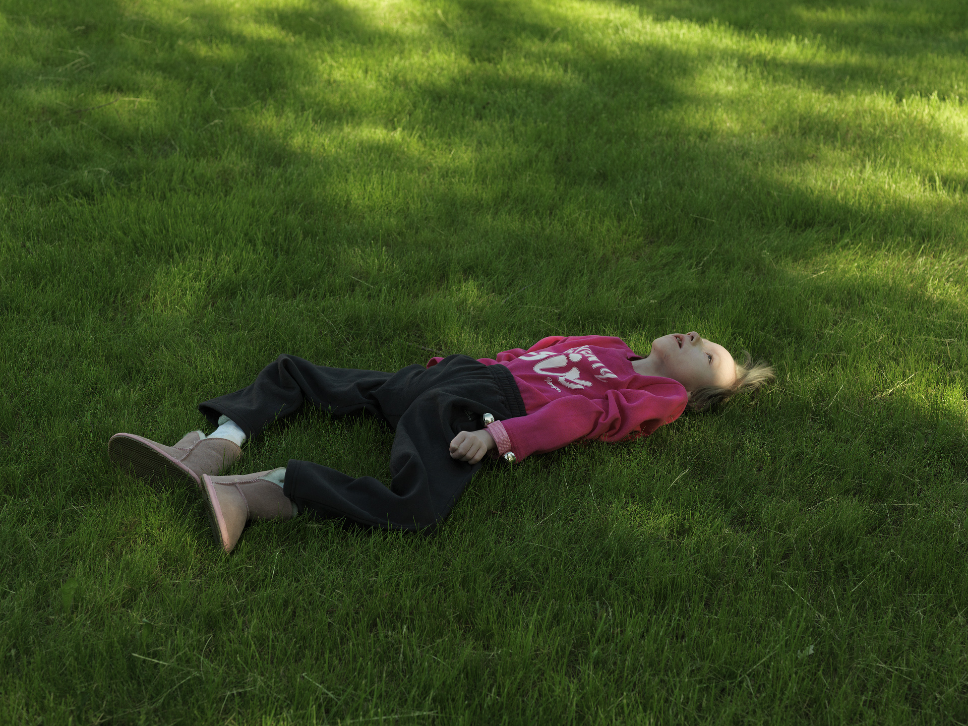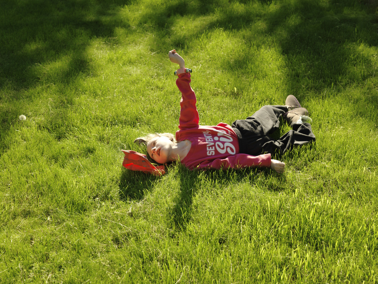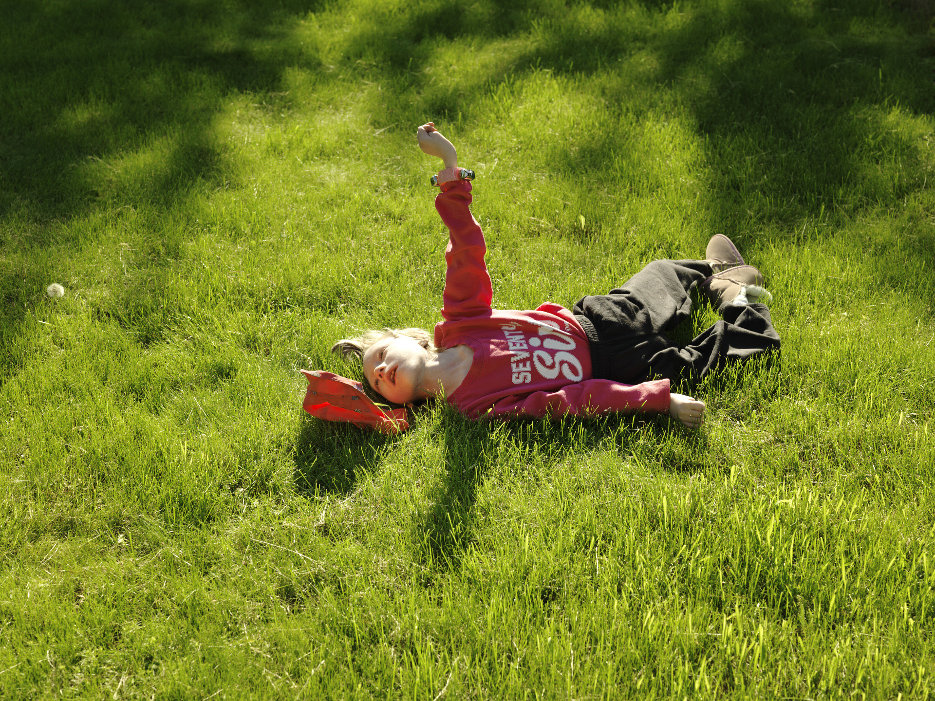 Лера между занятиями отдыхает на лужайке, любуется деревьями и внимательно слушает ветер.