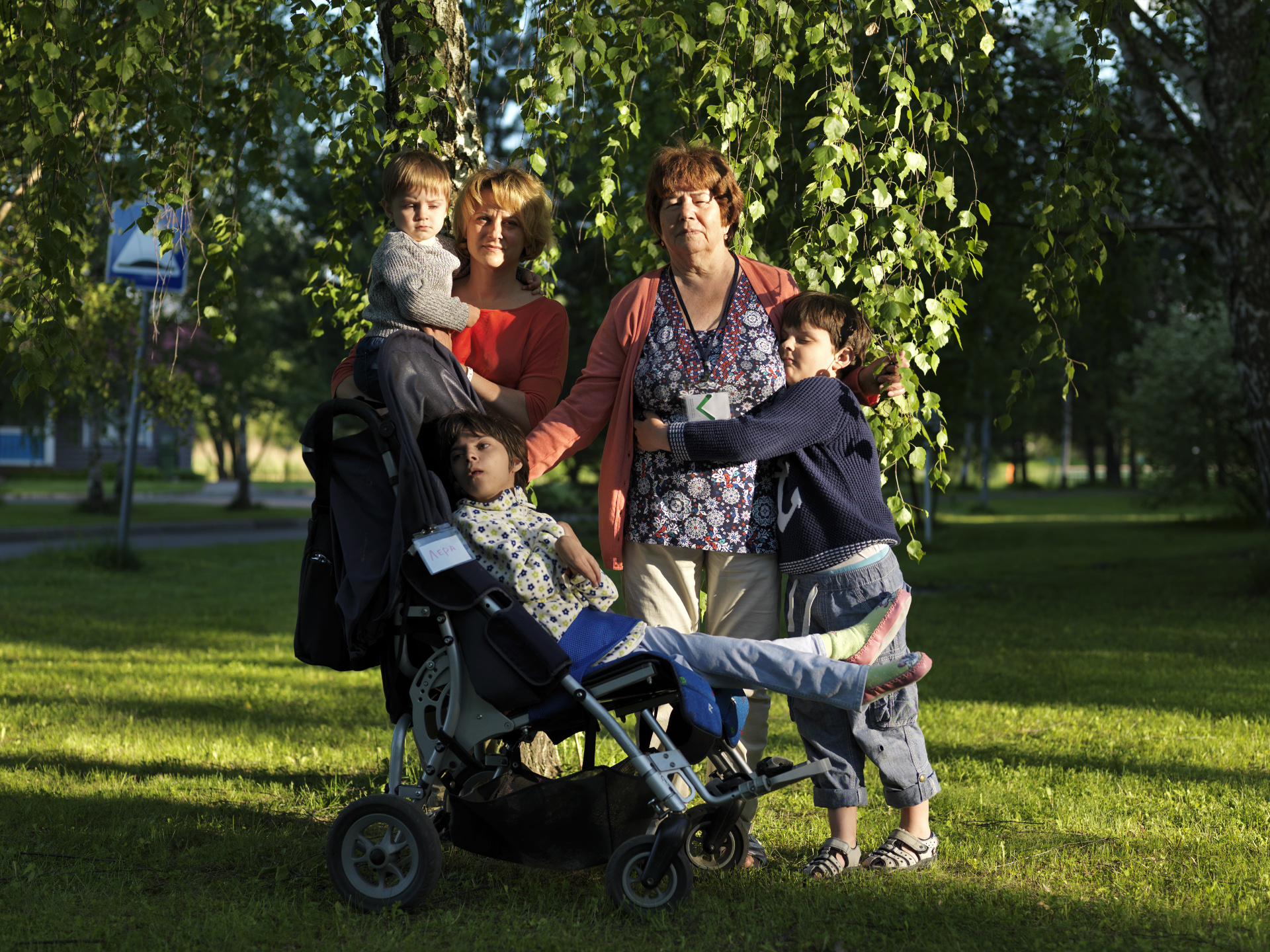 Лена с мамой, папой и братом Алешей. Отец Лены работает в автосервисе, мама раньше была секретарем-методистом в Институте физкультуры, но ей пришлось уйти с работы. Раньше у Лены не было инвалидного кресла, ее раз в неделю выносили во двор и качали на качелях. Благотворители фонда «Вера» помогли купить для нее кресло, которое стоит около 300 тысяч рублей, и теперь Лена может путешествовать.