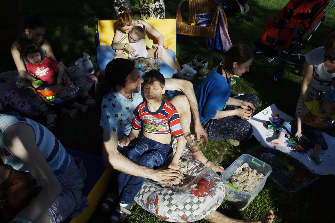 Занятия в лагере проходили на улице. Дети играли с тазами, наполненными фасолью, рисом, песком или водой.Фото: Алексей Кузьмичев для ТД Владельцы пятизвездочного отеля гольф-клуба Moscow Country Club — с огромными гольф-полями и шикарными номерами — не просто согласились принять лагерь, но и установили в своем ресторане блендер, чтобы молоть в кашу еду для наших детей, а его управляющий Аркадий гонял на машинках с мальчиком Кириллом, у которого огромная опухоль закрывает все лицо, и дарил мамам букеты цветов.