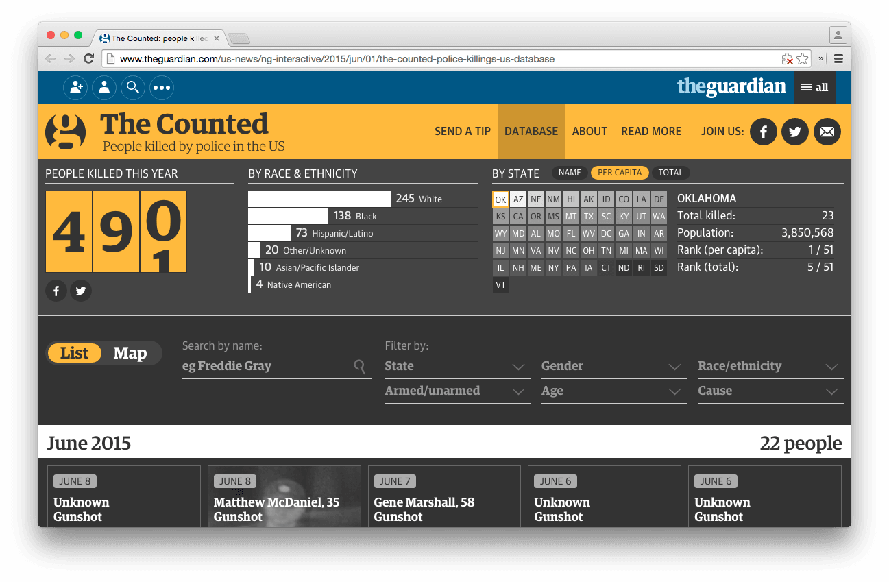 The Counted на данный момент содержит самую полную информацию по убийствам полицейскими в США и база будет обновляться журналистами The Guardian и другими участниками.