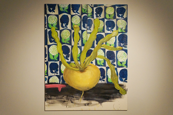 Другая работа на выставке — картина «Репка и кашалот» (2013) Юрия Лейдермана, хотя и проблематизирующего в последнее время свои отношения с концептуализмом (1, 2), но все же представителя концептуализма одесского, однако выделяющего в нем прежде всего «одесскость», что понятно в свете последних политических событий. Любопытно, что на выставке художник назван «гостем из другой реальности, наблюдателем из параллельной вселенной, описывающим нашу — но не для нас, а для своих “соплеменников”». Хоть из общего контекста и понятно, что имеются в виду вовсе не нынешние взаимоотношения России и Украины, — все же в столкновении с реалиями сегодняшнего дня эти слова обретают неожиданное звучание (добавим, что Газпромбанк находится в санкционном списке). Нарушающий привычную картину мира — или, как сказано в экспликации, «сюрреалистический» — принцип живописи Лейдермана продолжает концепцию проекта, основанного на обращении к символической логике тайных сообществ: изображение мира у художника строится в духе герметической поговорки obscurum per obscurius, ignotum per ignotius — «[объяснять] темное через еще более темное, неизвестное через еще более неизвестное».