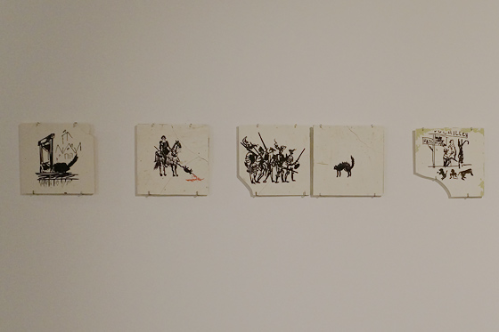 Что касается «Лаборатории», то от их большого проекта «Экспансивные виды МЭЛЗ», ранее показанного в параллельной программе Архитектурной биеннале в Венеции в 2012 году (в полном объеме с ним можно ознакомиться здесь), остаются лишь две серии — найденные на электрозаводе схемы и серия рисунков Потемкиной на плитках. По всей видимости, они выбраны как наиболее эмблематичные и таким образом органичные в этом «розенкрейцерском» контексте, а все остальное (огромное фабричное окно, календари с котиками, папки с изысканиями «Лаборатории» и другие предметы) оказывается за пределами выставки. В результате говорить об «Экспансивных видах МЭЛЗ» как о чем-то цельном вряд ли получится. Надо заметить, что, например, оккультистские сочинения — взгляните на тексты авторов вроде Папюса или Станисласа де Гуйата — во многом состояли из осколков древних учений, сохранившихся фрагментов легенд и вообще обрывков (плюс всякие додумывания от себя и прочее литературное творчество). Проект «Лаборатории», конечно, не потерян, и остальные его части вполне доступны, но само его настроение (он строится по большей части на находках и остатках) позволяет выдергивать из него отдельные элементы, а прочее представить как бы несуществующим.