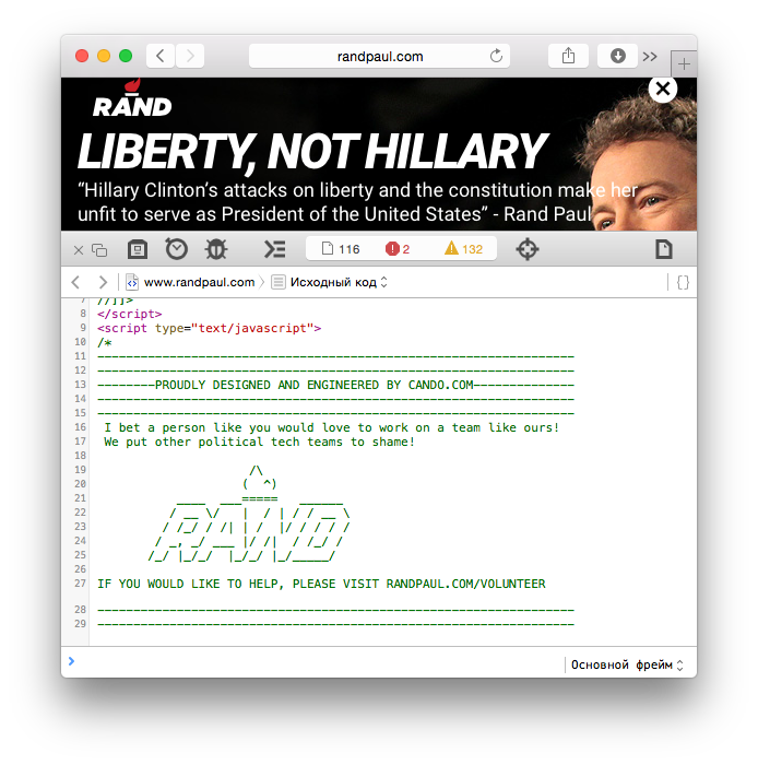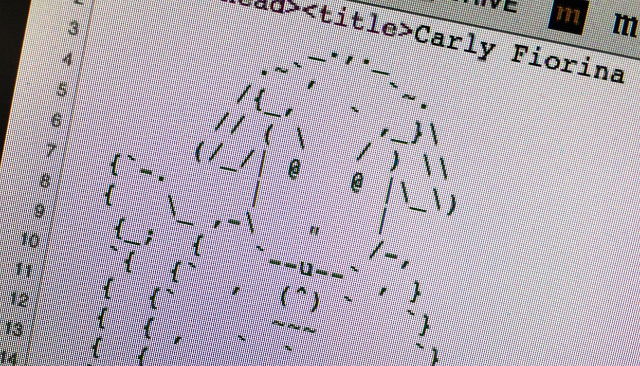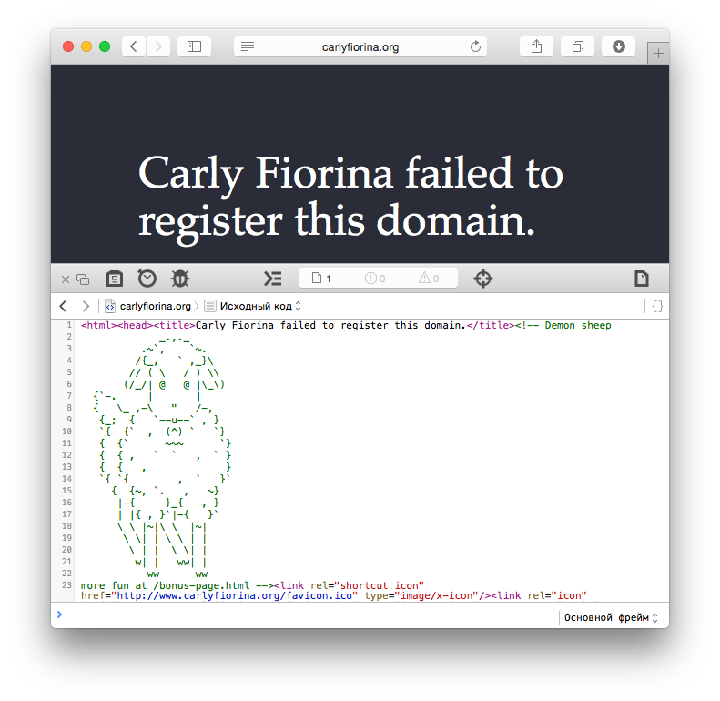 На собственном сайте Карли Фиорины, руководившей Hewlett-Packard в первой половине 2000-х, а теперь баллотирующейся в президенты США, ничего особенного найти не удалось. Но вот в коде сайта carlyfiorina.org, который Фиорина не успела вовремя занять, кто-то разместил адскую овечку из старой рекламы политика.
