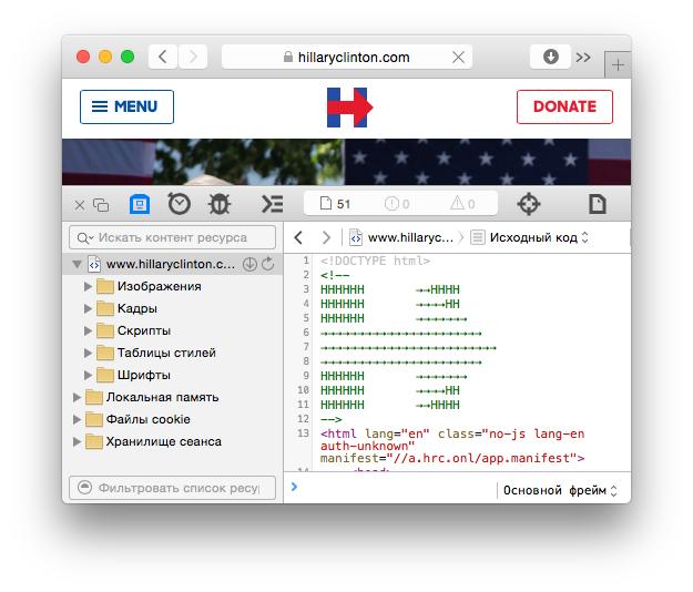 У возможного конкурента Джеба Буша, бывшего госсекретаря США Хиллари Клинтон «пасхальное яйцо» на сайте попроще: те, кто залезут в исходный код, увидят ASCII-логотип президентской кампании Клинтон.