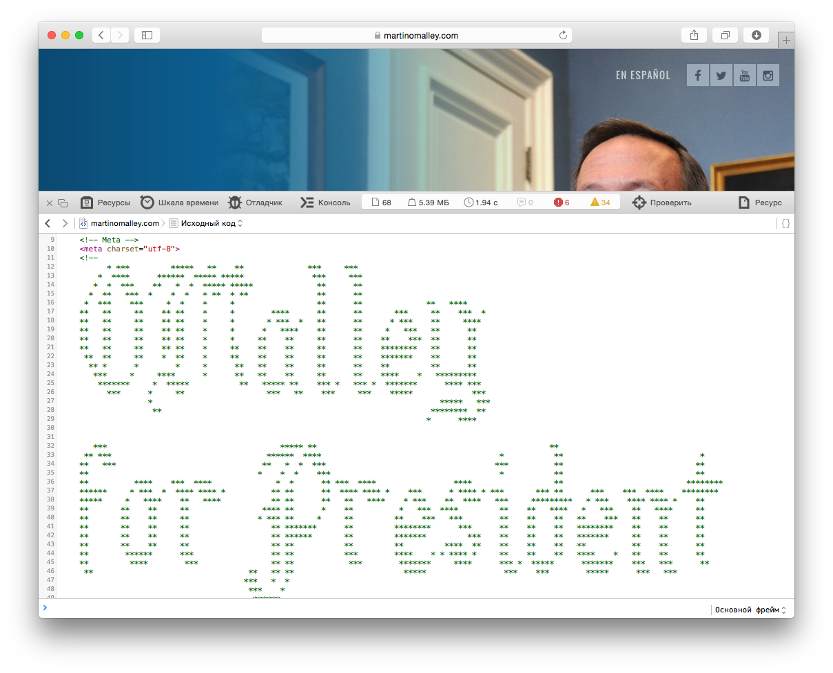 Мартин ОʼМэлли, соперник Клинтон по Демократической партии и бывший губернатор Мэриленда, ушел не сильно дальше и тоже оставил в исходном коде сайта ASCII-логотип. Только чуть посложнее.