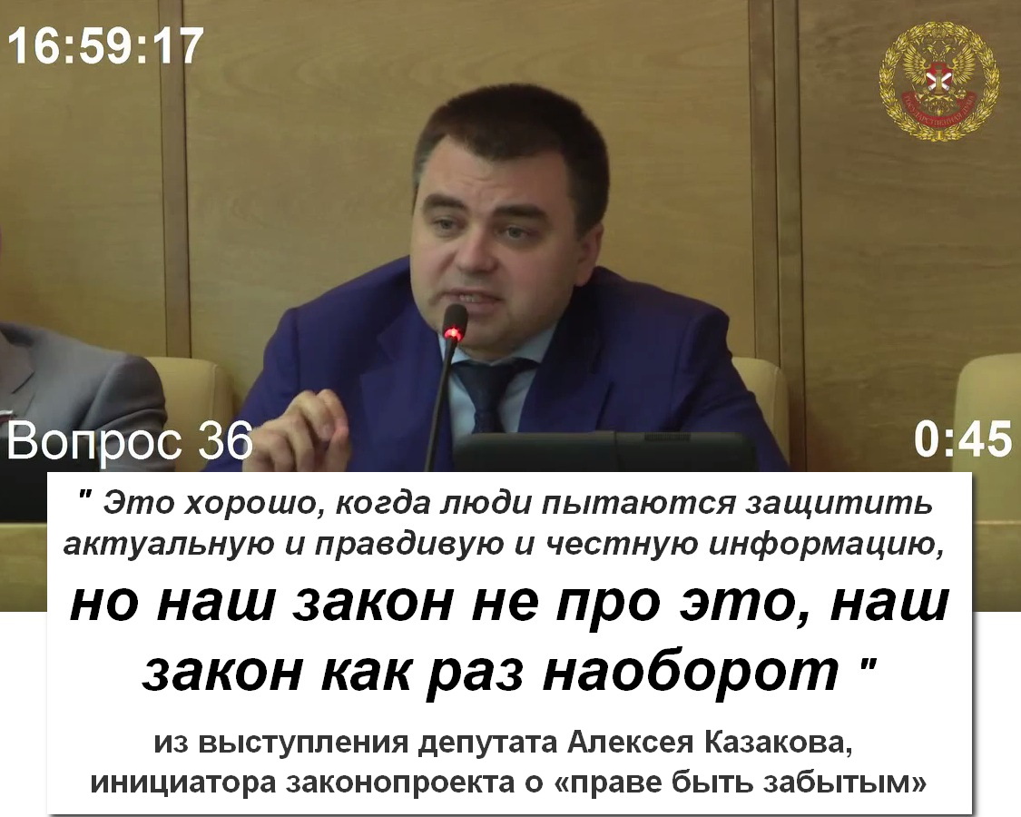«Это хорошо, когда люди пытаются защитить актуальную и правдивую и честную информацию, но наш закон не про это, наш закон как раз наоборот» (из выступления депутата Алексея Казакова, инициатора законопроекта о «праве быть забытым»).