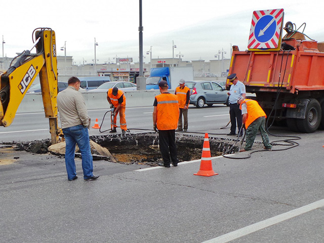 Размер провала составлял 1,5 на 2 метра, глубина - до 2 метров. В мэрии сообщили, что причиной ЧП стали сильные дожди и сброс вод из ближайшего торгового центра: они подмыли коммуникации под МКАД.