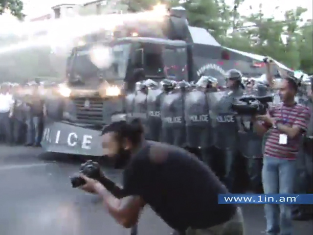 Видеотрансляцию с места событий вел портал 1in.am. На записанных кадрах запечатлено, как полиция, включив водометы, начала задерживать участников акции протеста, которые сидели на асфальте. Видно, что некоторые демонстранты сопротивлялись.