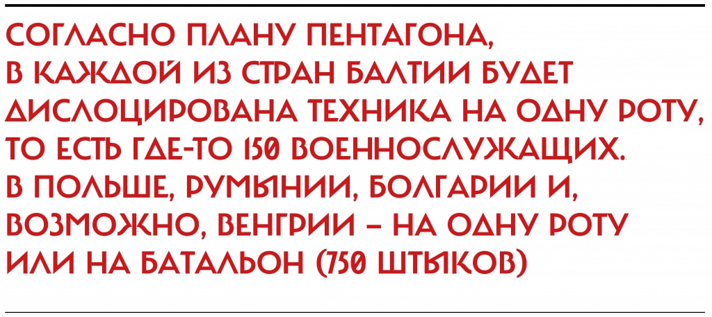 «Обстановка резко изменилась» Согласно плану Пентагона, в каждой из стран Балтии будет дислоцирована техника на одну роту, то есть где-то 150 военнослужащих. В Польше, Румынии, Болгарии и, возможно, Венгрии — на одну роту или на батальон (750 штыков). Предполагается, что склады с нею будут охраняться местными военными или охранными подрядчиками, а не американскими военнослужащими. Пентагон сейчас пытается определить стоимость модернизации железных дорог, строительства складских помещений и мастерских и замены старых советских военных объектов.