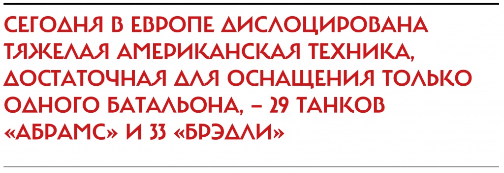 После точки — запятая В 2013 году армия США вывезла из Европы в Америку все остававшиеся там танки и БМП «Брэдли», полагая, что поставила тем самым жирную точку на Холодной войне, в разгар которой она держала в Германии 20 бронетанковых дивизий примерно с 6 тыс. танков. Сегодня в Европе дислоцирована тяжелая американская техника, достаточная для оснащения только одного батальона, — 29 танков «Абрамс» и 33 «Брэдли». Совокупно эта техника называется European Activity Set — ею пользуются американские военнослужащие, которых перебрасывают на учения в Старый Свет.